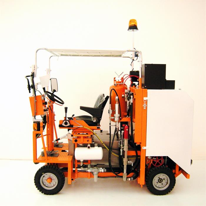 Selvkørende ride-on airless-maskine til arbejde, hvor en stor malekapacitet, høj mærkningsevne og stabilitet skal garanteres med en kompakt 4-hjulet ride-on-maskine. Den selvkørende ride-on-afmærkningsmaskine med hydraulisk drev kan konfigureres individuelt.